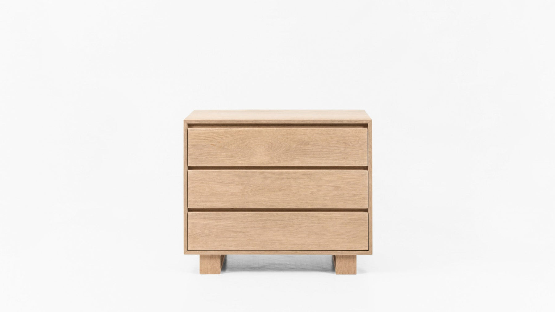 The Box Drawers express honest craftsmanship through clean joinery and the purity of line. A solid timber frame sits atop a recessed base, creating a subtle floating effect that lightens the piece’s visual weight. Negative handle details and soft close drawers maintain a seamless façade, allowing the natural grain and tone of the wood to take centre stage.