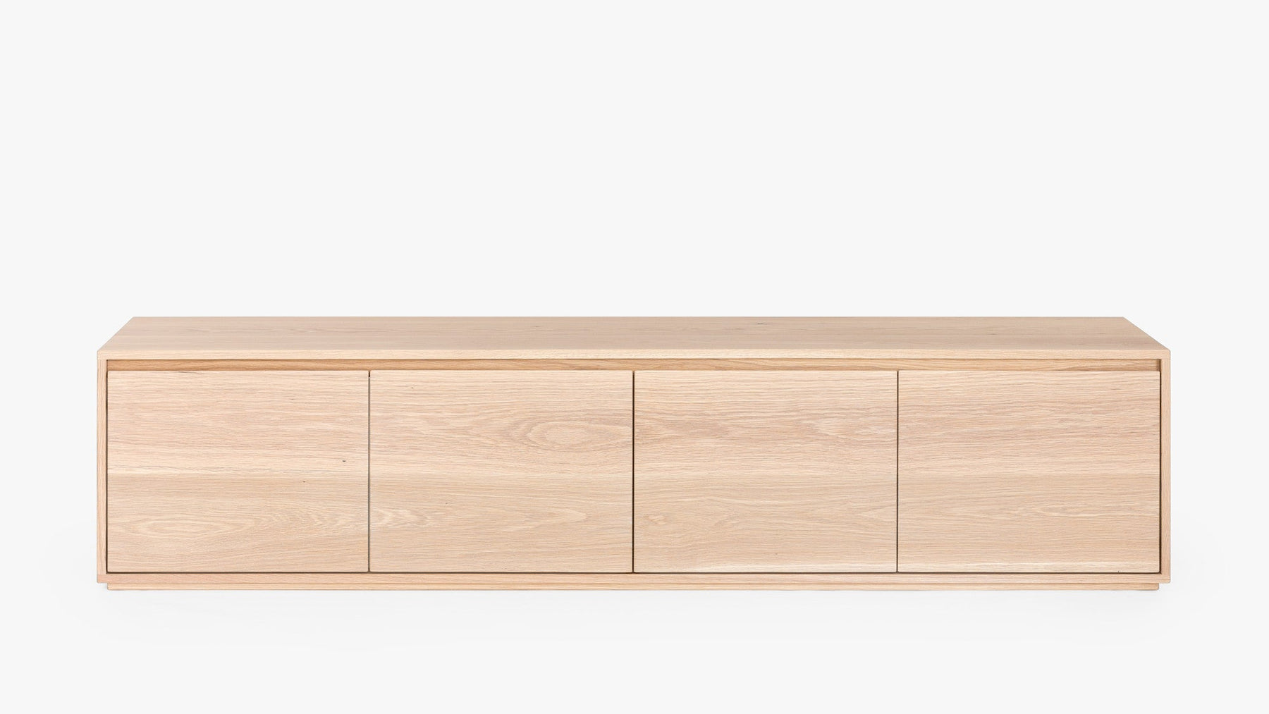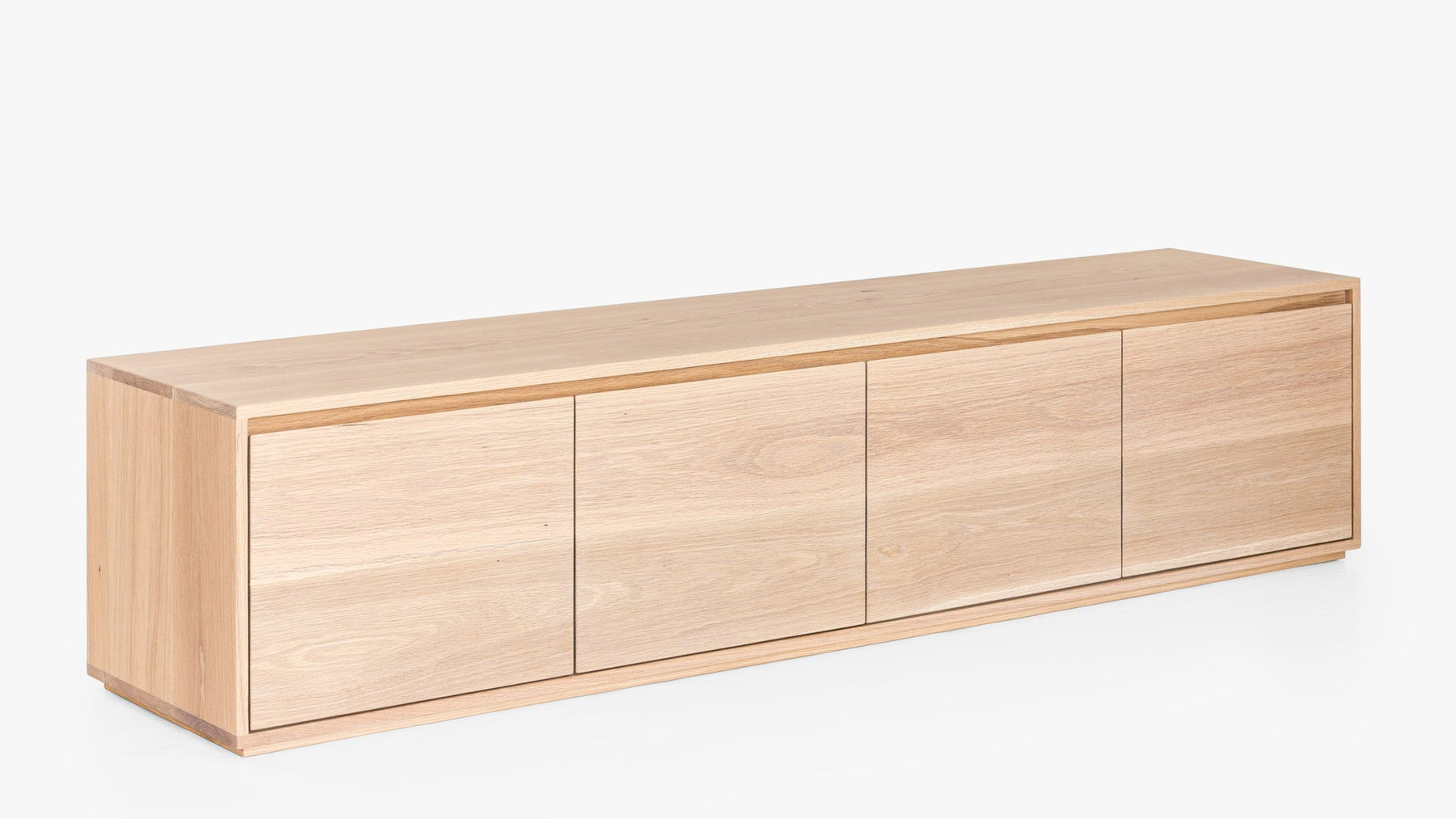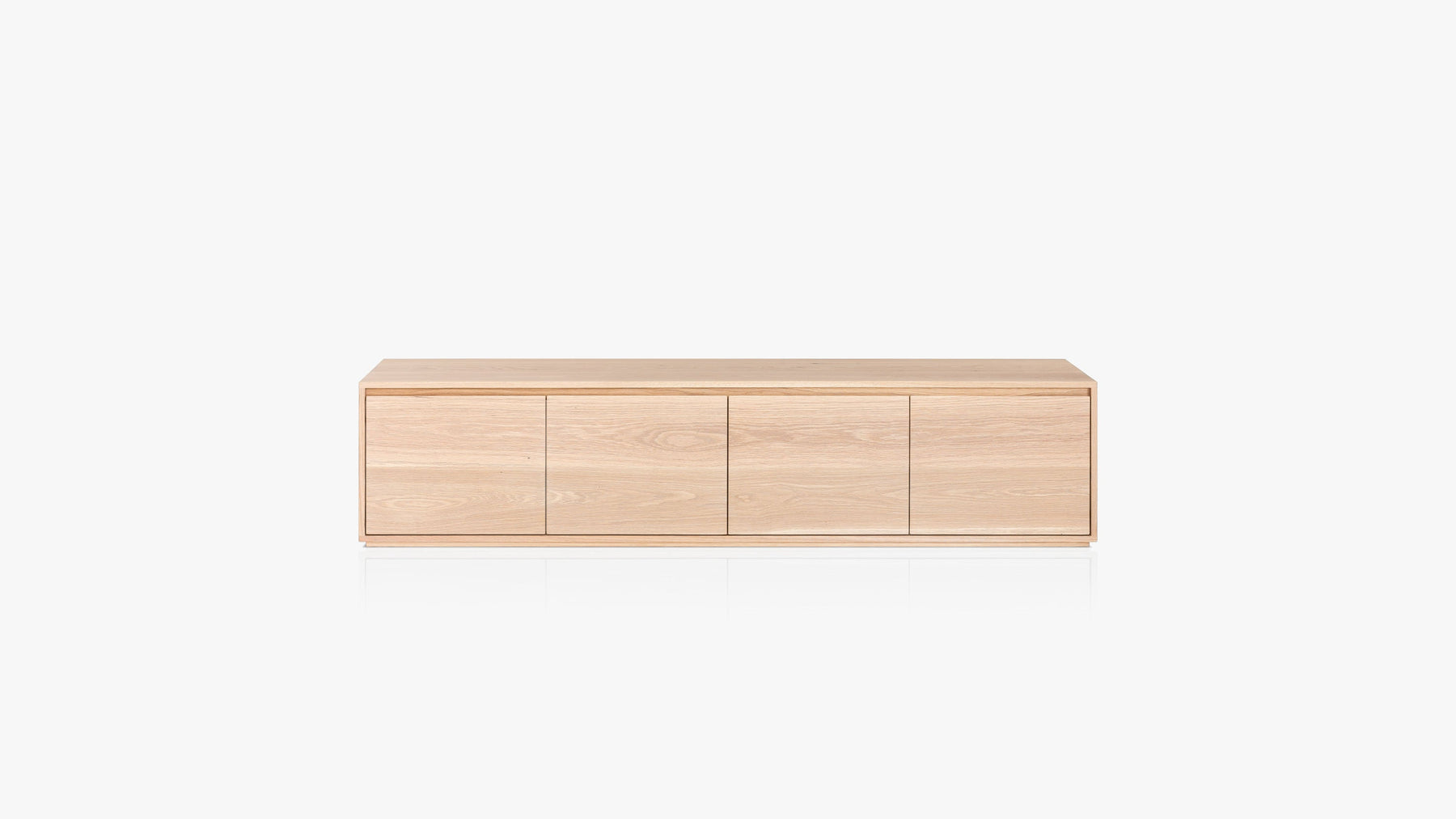 Defined by architectural precision, the Box Entertainment Unit features a rectangular timber body set above a recessed plinth, lending the piece its signature “floating” silhouette. Hidden joinery and handleless doors maintain an unbroken flow of grain, combining storage and serenity in one quietly confident design.