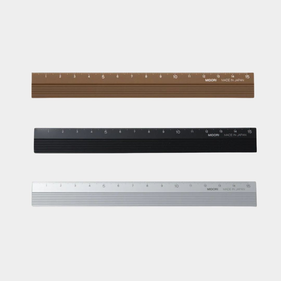 Introducing the slim and functional Midori Aluminium Ruler. Crafted from high-quality aluminium in a sleek minimalist design, this ruler features a laser-engraved scale that won't fade over time. Plus, its tapered bottom makes it easy to grab when resting on a desk. Elevate your stationery game with this must-have tool.