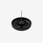 Crafted from zinc metal with a matte black finish reminiscent of cast iron, it offers a refined yet understated presence. The double-circle design creates a natural ash collector, keeping surfaces clean while enhancing the ritual of burning incense.