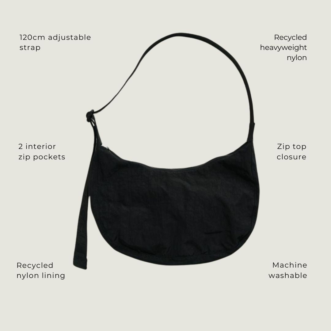 The Baggu Black crossbody bag is stylish and practical. The medium size is large enough to carry more than just your daily essentials, with two internal zippers to make it easy to organise your things. The crescent shape looks great and makes it easy to look inside with everything within reach.