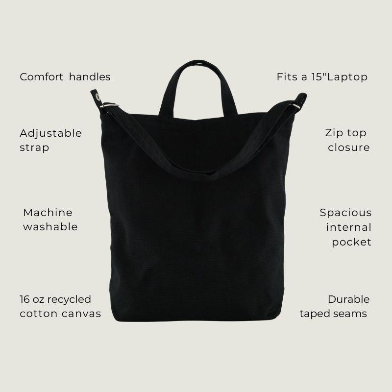 The Baggu Black tote bag is the perfect everyday size for your trips to the market, class, work or for a day out. One of the benefits of canvas is its strength and that it is machine washable.