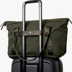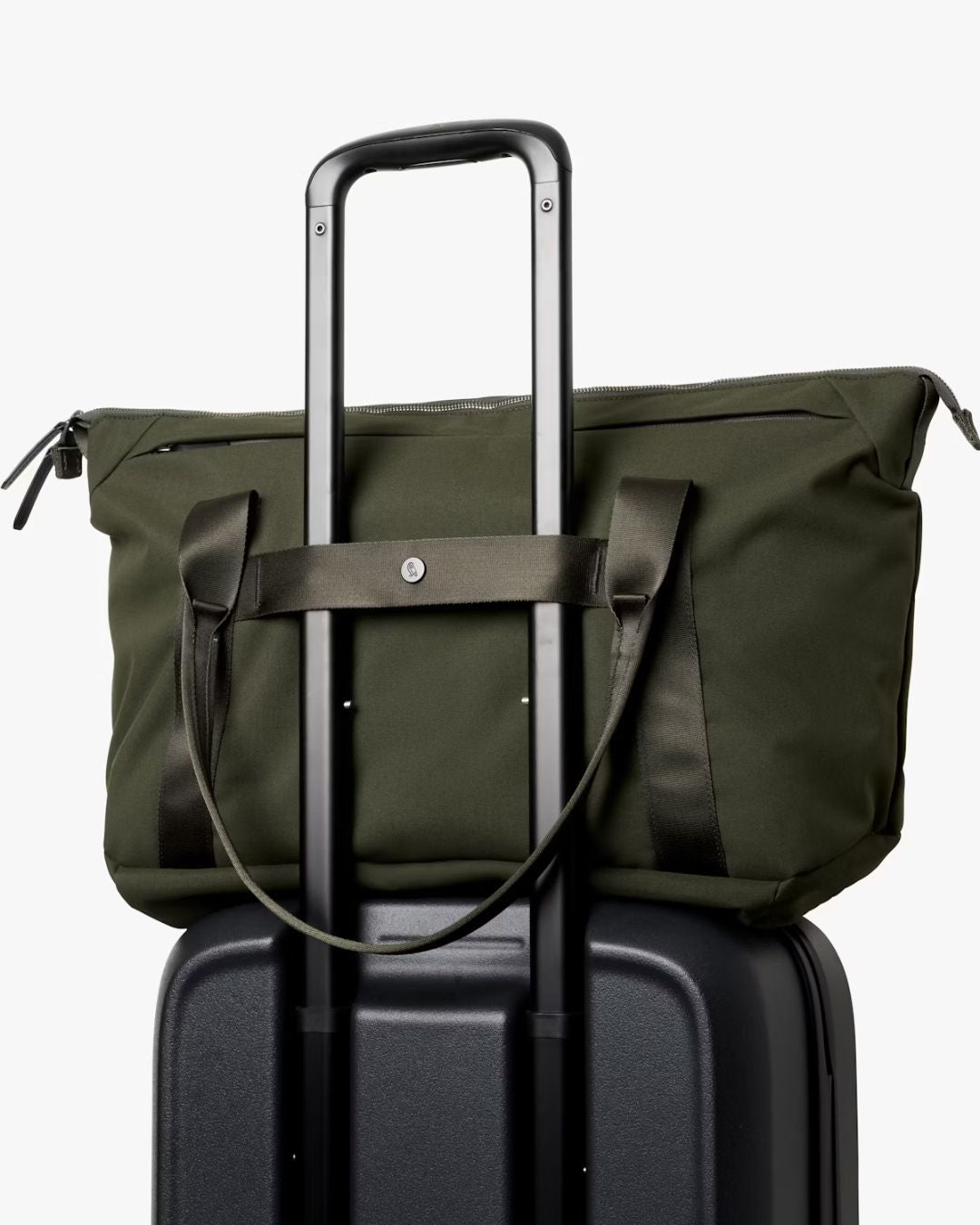The Classic Getaway Bag is designed for short trips and weekends away with a larger 28L capacity. A zip closure secures contents, while interior pockets keep smaller items organised and dual pop pockets hold a water bottle upright. Folded webbing handles provide comfortable all-day carry, and a luggage pass-through sleeve with press stud slides over rolling luggage handles for easy transport.