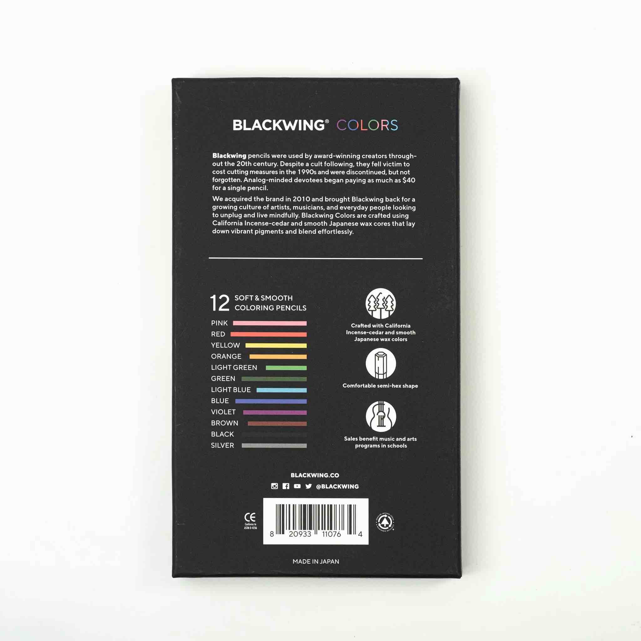 The 12 pack includes 12 beautiful colours that will meet all your needs — Pink, Red, Yellow, Orange, Light Green, Green, Light Blue, Blue, Violet, Brown, Black, Silver. With Blackwing Colour Pencils, you will be able to create artwork that is truly unique.