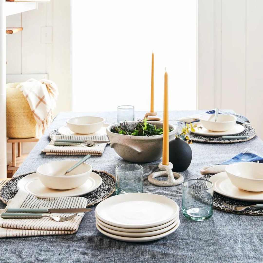 The Stacks tablecloth pairs perfectly with your favourite dinnerware, this tablecloth is inspired by the play between shadow and light, reminding us of warm sunlight casting shadows through windows in the early evening.