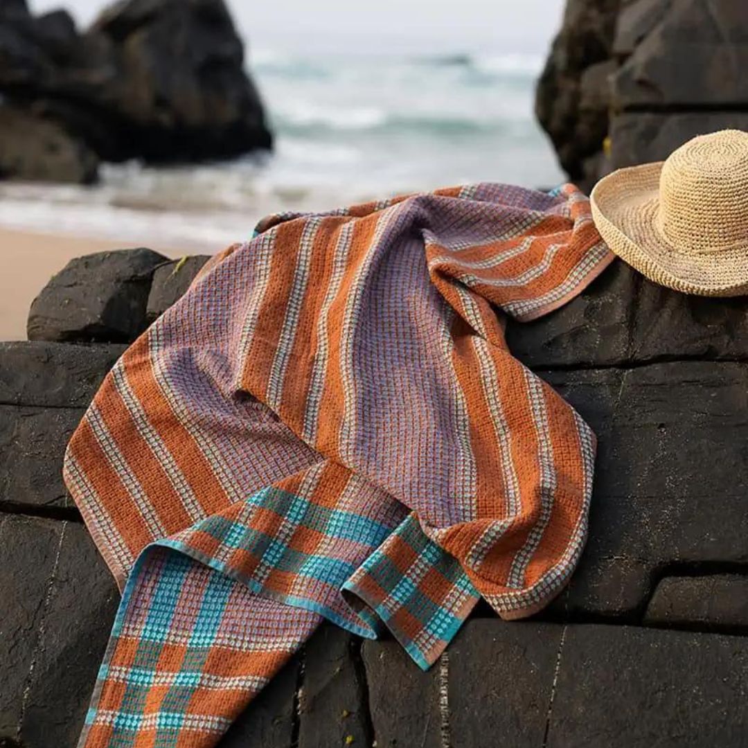 Organic cotton beach towel woven with GOTS-certified organic threads. Absorbent, soft and kaleidoscopic in colour. Woven with a playful ‘recess’ weave for great absorbency while being soft and supple to the touch.