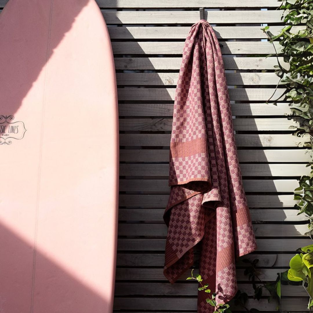 A colourful cotton beach towel with a unique checkerboard design. Woven with a traditional pattern that has been used for toweling long before the mass production of the terry towel.