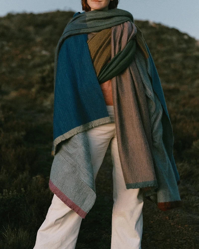 A luxurious, handcrafted textile that combines traditional craftsmanship with exceptional natural fibers to create a versatile, year-round accessory. Combining bamboo's dreamy drape with kid mohair and silk's warmth and shimmer, each wrap features a timeless herringbone weave and true selvedge finish. Soft, warm, and subtly lustrous, it's perfect for draping over shoulders or wrapping up through changing seasons. Made with premium South African mohair.