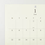 A wall calendar designed for the joy of writing. Made with MD PAPER Thick, it works beautifully with fountain pens—even bold lines and dark inks won't bleed through. Spacious monthly grids give you room for daily notes, ideas, and little drawings. The simple design with quiet dates lets you make the year your own. Wide margins catch your passing thoughts. Three sizes to fit wherever you need.