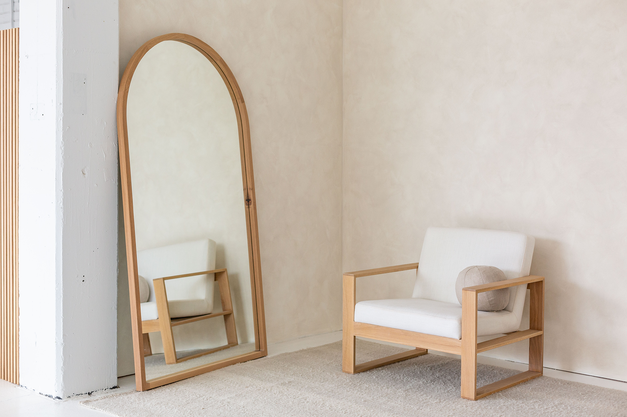The Arch Floor Mirror is a sculptural piece that brings warmth and sophistication to any room. Its gracefully curved timber frame, handcrafted from solid wood, creates a soft, welcoming silhouette. Available in two sizes and a selection of timbers, this mirror is designed to reflect not just your image, but the beauty of natural materials and thoughtful craftsmanship.